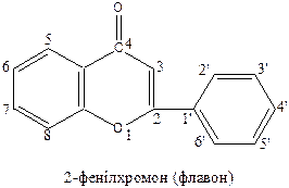 Шестичленні гетероцикли з Оксигеном у кільці — група пірану. Пірани, пірони, хромон (бенз- g -пірон), флавон (2-фенілхромон):