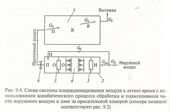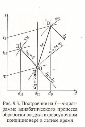 Обрабатываемая часть наружного воздуха Gдп, кг/ч, имеет на входе в дождевое пространство параметры, соответствующие точке Н (рис. 9.5), а на выходе из оросительной камеры – параметры состояния, характеризуемые точкой О (как результат адиабатического процесса).