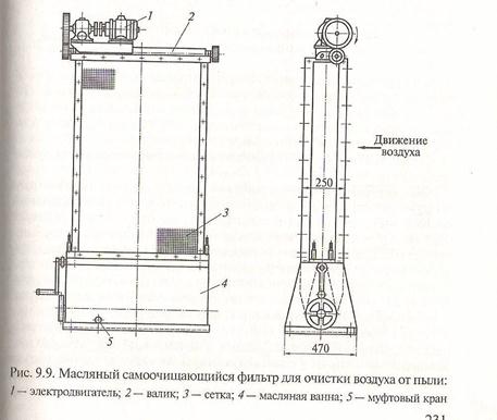 Масляный самоочищающийся фильтр для очистки воздуха от пыли (рис. 9.9) состоит из двух последовательно установленных панелей, из которых каждая представляет собой непрерывную ленту из сетки 3, перемещаемой с помощью валиков 2, вращающихся от электродвигателя 1. На пути движения панель проходит через масляную ванну 4, на дне которой смонтирована ручная мешалка для взмучивания осадка перед его удалением. Отработавшее масло из ванны удаляют через нижний муфтовый кран 5 самотеком или с помощью насоса.