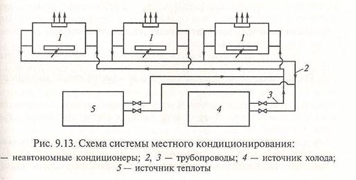 Местные системы кондиционирования воздуха получили широкое распространение в России и за рубежом. Структурная схема такой системы показана на рис. 9.13.
