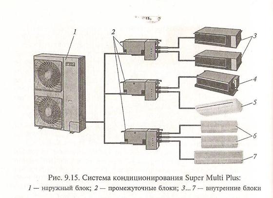 Система кондиционирования Super Multi Plus (рис. 9.15) японской фирмы Daikin состоит из наружног блока 1 мощностью 14,5 кВт и семи внутренних блоков 3…7 мощностью 2,5…7,1 кВт. Система допускает использование пяти типов внутренних блоков 3…7 от настенных до канальных (всего 17 типоразмеров). Максимальная суммарная протяженность труб такой системы – 115м, что дает свободу при выборе места установки внутренних блоков. Группы, состоящие из двух-трех внутренних блоков, подключают к внещнему устройству (наружному блоку) 1 через промежуточные блоки 2. Это позволяет существенно сократить расход труб и уменьшить занимаемый ими объем. Микропроцессорное управление позволяет поддерживать заданную температуру с очень высокой точностью. Уровень шума наружного блока не превышает 50 дБ.