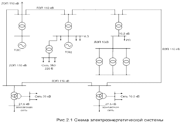 Система внешнего электроснабжения электрических железных дорог. ЭЖД получают электроэнергию от электроэнергетических систем (энергосистем). Электроэнергетическая система – это совокупность взаимосвязанных элементов, предназначенных для производства, преобразования, передачи, распределения и потребления электроэнергии. К элементам электроэнергетической системы относятся: генераторы, преобразующие механическую энергию в электрическую; трансформаторы, преобразующие величины напряжений и токов; линии электропередачи (ЛЭП), предназначенные для транспортировки электроэнергии на расстояние; вспомогательное оборудование, изменяющее свойства системы; устройства управления и регулирования. Электроэнергия от генераторов электростанций через подстанции, ЛЭП различного напряжения и тяговые подстанции преобразуется по роду тока и напряжения и через тяговую сеть передаётся ЭПС. Вся совокупность устройств от генераторов электростанций до первичных шин составляет первичную (внешнюю) часть системы электроснабжения ЭЖД. От этой системы питаются электроэнергией тяговые потребители – электровозы, электропоезда; нетяговые железнодорожные потребители; районные нетранспортные потребители (промышленные и сельскохозяйственные потребители). Электрификация ЖД решает не только транспортную проблему, но и решает проблему электрификации страны. На рис. 2.1. приведена схема системы внешнего электроснабжения ЭЖД.
