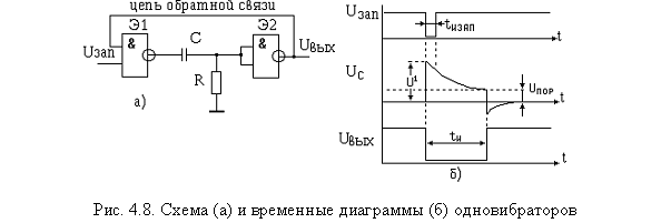 Генератор одиночных импульсов (ждущий мультивибратор). Ждущий мультивибратор называют также одновибратором. Одновибраторы предназначены для вырабатывания одиночных импульсов с заданной длительностью. При этом длительность запускающего импульса особой роли не играет, лишь бы она была не больше длительности вырабатываемого одновибратором импульса, т.е. tи зап<tи, где tи зап - длительность запускающего импульса; tи - длительность выходного импульса одновибратора. Схема одновибратора приведена на рис. 4.8, а. Он выполнен на двух элементах логики типа 2И-НЕ путем введения положительной обратной связи (выход второго элемента соединен с входом первого). В исходном состоянии на выходе элемента Э2 имеется уровень “1”, а на выходе элемента Э1- “0”, так как на обоих его входах имеется “1”(запускающие импульсы представляют отрицательный перепад напряжения). При поступлении на вход запускающего отрицательного перепада напряжения на выходе первого элемента появится уровень “1”, т.е. положительный скачок, который через конденсатор С поступит на вход второго элемента. Элемент Э2 инвертирует этот сигнал и уровень “0” по цепи обратной связи подается на второй вход элемента Э1. На выходе элемента Э2 поддерживается уровень “0” до тех пор, пока не зарядится конденсатор С до уровня Uc пор = U1 - Uпор, а напряжение на резисторе R не достигнет порогового уровня Uпор (рис. 4.8, б). Длительность выходного импульса одновибратора может быть определена с помощью выражения