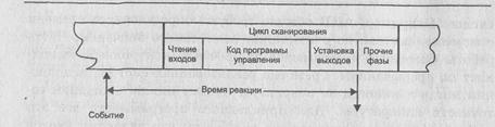 Рисунок 5 – Время реакции ПЛК Худший случай, когда изменение значений входов происходит сразу после фазы чтения входов. Тогда время реакции будет наибольшим, равным удвоенному времени сканирования минус время одного чтения входов. Иными словами, время реакции ПЛК не превышает удвоенного времени сканирования. Помимо времени реакции ПЛК, существенное значение имеет время реакции датчиков и исполнительных механизмов, которое также необходимо учитывать при оценке общего времени реакции системы. Существуют ПЛК, которые реализуют команды непосредственного доступа к аппаратуре входов и выходов, что позволяет обрабатывать и формировать отдельные сигналы с длительностью меньшей длительности рабочего цикла. Для уменьшения времени реакции сканирующих контроллеров алгоритм программы разбивается на несколько задач с различным периодом исполнения. В наиболее развитых системах пользователь имеет возможность создавать отдельные программы, исполняемые по прерыванию, помимо кода, исполняемого в рабочем цикле. Такая техника позволяет ПЛК существенно форсировать ограничение реакции временем сканирования при небольшом количестве входов, требующих сверхскоростной реакции. Время цикла сканирования является базовым показателем быстродействия ПЛК. При измерении времени рабочего цикла пользовательская программа должна содержать 1К логических команд. Для ПЛК, поддерживающих стандарт МЭК 61131-3, используют команды на языке IL. Иногда изготовители приводят несколько значений времени цикла, полученных при работе с переменными различной разрядности. Ориентировочно о скорости обработки различных типов данных можно судить по тактовой частоте и разрядности центрального процессора. Хотя нет ничего удивительного в том, что восьмиразрядные ПЛК не редко оказываются быстрее 32-разрядных при выполнении битовых операций. Объясняется это тем, что в 8-разрядных микропроцессорах более распространена аппаратная поддержка работы с битами. Так, в РС-совместимых процессорах для выделения бита приходится использовать логические команды и циклический сдвиг. Устройство ПЛК Аппаратно ПЛК является вычислительной машиной. Поэтому архитектура его процессорного ядра практически не отличается от архитектуры компьютера. Отличия заключены в составе периферийного оборудования, отсутствуют видеоплата, средства ручного ввода и дисковая подсистема. Вместо них ПЛК имеет блоки входов и выходов. Конструктивно контроллеры подразделяют на моноблочные, модульные и распределенные. Моноблочные, или одноплатные, ПЛК имеют фиксированный набор входов-выходов. В модульных контроллерах модули входов-выходов устанавливаются в разном составе и количестве в зависимости от требуемой конфигурации. Так достигается минимальная аппаратная избыточность. В распределенных системах модули или даже отдельные входы - выходы, образующие единую систему управления, могут быть разнесены на значительные расстояния. Характерным для современных контроллеров является использование многопроцессорных решений. В этом случае модули ввода - вывода имеют собственные микропроцессоры, выполняющие необходимую предварительную обработку данных. Модуль центрального процессора имеет выделенную скоростную магистраль данных для работы с памятью и отдельную магистраль (сеть) для общ