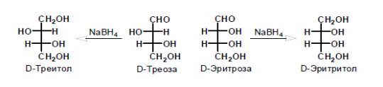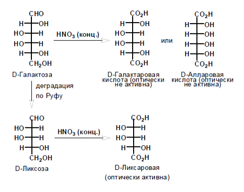 Аналогичные превращения с L-галактозой дают такие же результаты, за исключением противоположного знака оптического вращения. Следовательно, подобным путем можно выяснить лишь относительную конфигурацию исследуемых молекул, но не их абсолютные конфигурации. В настоящее время, конечно, легче записать спектры ЯМР диастереомера и провести отнесение с их помощью, чем заниматься малопродуктивной работой по химическому превращению.