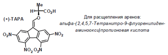 Метод расщепления рацематов путем превращения их в диастереомеры не пригоден для соединений, не имеющих функциональных групп (алканов, галогеналканов, простых эфиров в т.ч. эпоксидов, сульфоксидов, фосфинов). Для расщепления таких рацематов были использованы процессы комплексообразования (метод разделения рацемата через молекулярные соединения). Например, способность мочевины к образованию соединений включения − клатратов. Мочевина, сама по себе ахиральное соединение, и кристаллизуется в тетрагональной решётке, но в присутствии молекул “гостя” карбамид кристаллизуется в хиральной гексагональной решетке, в спиральных цилиндрических каналах которой могут размещаться молекулы “гостя”. Обычно, это стержневые малополярные молекулы. Кристаллы мочевины представляют собой право- и левовращающие спирали, поэтому клатраты мочевины с энантиомерами приобретают характер диастереомеров. Разделение рацемата по этому способу осуществляют внесением затравки одного из энантиомеров в насыщенный раствор смеси мочевины с рацематом. Выпадающие при этом кристаллы клатрата обогащены именно внесенным энантиомером. Либо, как в случае 2-хлороктана происходит преимущественное включение (+)-изомера в правую решётку мочевины, а (−)- в левую. Такими же свойствами обладают и циклодекстрины, состоящие из шести или более молекул оптически активных D-сахаров, связанных в кольцо. Отметим, что такие случаи разделения крайне редки, и до недавнего времени представляли лишь теоретический интерес. Арены разделяют через π-комплексы с оптически активными акцепторами, например с α-(2,4,5,7-тетранитро-9-флуоренилиденаминоокси)пропионовая кислота (TAPA). Её комплексы с различными хиральными аренами обладают достаточной устойчивостью и могут быть разделены перекристаллизацией.
