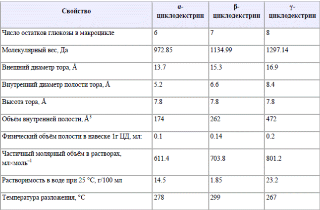 В нижеприведённой таблице − основные свойства циклодекстринов: