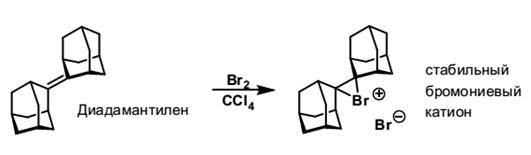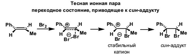 В этих примерах бромониевый ион, образующийся на первой стадии, оказывается менее выгоден, чем образующийся при его раскрытии чрезвычайно стабильный бензильный катион. И присоединение, вероятно, идёт преимущественно через образование тесной ионной пары типа: