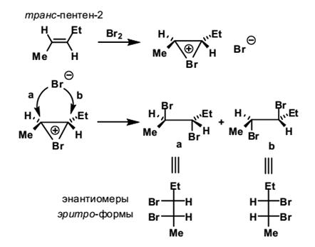 В случае несимметрично замещенных алкенов это приводит к двум энантиомерам трео-формы при присоединении брома к цис-изомеру или к энантиомерам эритро-формы при галоидировании транс-изомера. Это действительно наблюдается при присоединении брома, например, к цис- и транс-изомерам пентена-2.