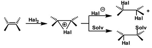 В тех случаях, когда присоединение галогена к двойной связи проводится в среде нуклеофильных растворителей, растворитель эффективно конкурирует с галогенид-ионом при раскрытии трехчленного цикла галогенониевого иона: