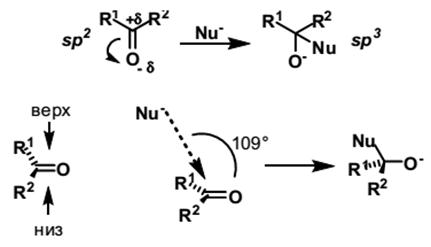 Из реакций нуклеофильного присоединения к карбонильной группе наибольший интерес с точки зрения стереохимии представляют реакции восстановления, присоединения металлоорганических реагентов (реактивы Гриньяра, Реформатского, литийорганический соединения, диалкилкупраты и пр.) и синильной кислоты. Во многих случаях реакция протекает с высокой степенью диастереоспецифичности или даже, в присутствии хиральных катализаторов – энантиоспецифичности. Таким образом, реакции присоединения позволяют осуществить стереонаправленный синтез спиртов – одного из важнейших классов органических веществ. Из наиболее общих моментов нуклеофильного присоединения следует знать, что атака нуклеофила по карбонильному фрагменту осуществляется под углом примерно равном валентному в sp3 гибридизированном атоме углерода, т.е. ∠ NuCO ∼ 109°.