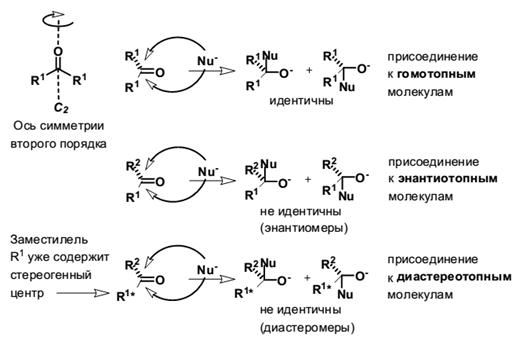 Интереснее дело обстоит, когда R1 ≠ R2. Нуклеофильная атака сверху приводит к соединению, которое является зеркальным отражением соединения, образующегося при атаке того же нуклеофила с нижней стороны. Т.е. в этом случае продукты реакции составляют пару энантиомеров, а сама карбонильная группа называется энантиотопной. Ещё сложнее протекает реакция, когда в карбонильном соединении один из заместителей (например, R1) сам содержит стереогенный центр. Тогда результатом присоединения нуклеофила будет пара диастеромеров, а исходное соединение – диастереотопным. Поясним сказанное на примерах.