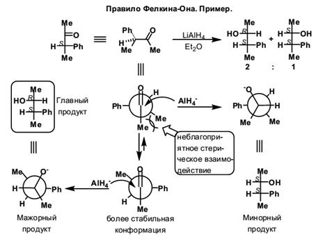 Конечно, мажорные продукты, образующиеся в соответствии с правилом Крама и Фелкина-Она, одинаковы. Но рассмотрение переходного состояния в модели Фелкина-Она позволяет объяснить факты, не согласующиеся с предсказанными правилом Крама, т.е. исключения.