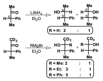 Преобладание одного из стереоизомерных продуктов возрастает по мере увеличения различия в стерических объёмах S и M. Когда S и M близки по размеру, разница в энергии их взаимодействия с R незначительна, а диастереоселективность нуклеофильных реакций с участием таких молекул очень низкая. Следующая таблица демонстрирует сказанное: