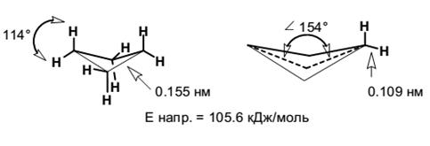 В циклобутане наблюдаются два вида напряжений: угловое и торсионное, причем оба напряжения менее выражены, чем в циклопропане. Циклобутан имеет не плоское строение, угол складчатости по линии С1−С3 примерно 26°. Такая конформация обусловлена стремлением уменьшить торсионное взаимодействие восьми заслонённых С−Н связей.