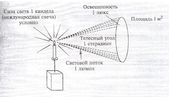 Видимое излучение характеризуют такие величины как световой поток, сила света, освещенность и яркость, связь между которыми показана на рисунке 1.