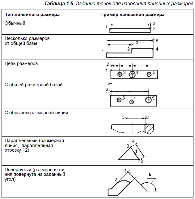 Оформление элементов чертежа Чертеж, как правило, состоит из изображения изделия, выполненного в ортогональных проекциях, которое дополняется вспомогательной графической и текстовой информацией. Форма представления этой информации должна отвечать требованиям действующих стандартов ЕСКД. Размеры выражают основные геометрические характеристики объектов. Размеры бывают четырех основные типов: линейные, угловые, диаметральные, радиальные. Линейные размеры делятся на горизонтальные, вертикальные, параллельные, повернутые. Различают способы нанесения размеров от одной или нескольких общих баз. Двумерные редакторы предоставляют средства нанесения размеров, которые существенно упрощают этот трудоемкий процесс. Наиболее распространенным является режим полуавтоматического нанесения размеров. В этом режиме пользователю необходимо указать нужный элемент и установить размерное число в требуемую точку. На основе этих данных система автоматически формирует выносные и размерные линии и рассчитывает размерное число. Вид размеров и способов их ввода в базу данных определяется набором размерных переменных. Размерными переменными можно управлять. В большинстве систем предусматривается возможность создания ассоциативных размеров, которые автоматически пересчитываются и перерисовываются при редактировании соответствующих фрагментов изображений. Размеры линейные. В табл. 1.5 перечислены типы линейных размеров, полуавтоматическое нанесение которых обеспечивается в двумерных редакторах. При вводе обычного (одиночного) горизонтального или вертикального размера необходимо указать точки 1 и 2 выхода выносных линий и точку 3 пересечения размерной линии со второй выносной линией. Система автоматически располагает выносные линии параллельно друг другу, а размерную линию — перпендикулярно им. Если длина размерной линии меньше суммарной длины двух стрелок, стрелки автоматически будут сформированы снаружи выносных линий.