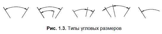 Если нужно, чтобы размерная надпись сформировалась автоматически с простановкой квалитета и значений допусков, то пользователю следует выбрать из меню параметров задание квалитета. Если отсутствует необходимость автоматического формирования размерной надписи, то текст надписи вводит пользователь, при этом по умолчанию предлагается надпись, содержащая только точное значение размера, измеренное по координатам выносных линий. Система автоматически определяет длину введенной размерной надписи, исходя из параметров текста. Если надпись помещается между выносными линиями, запрашивается подтверждение на такое ее размещение. В противном случае или при отказе пользователю предлагаются следующие варианты: □ указать положение надписи (по умолчанию); □ разместить надпись на полке; □ ручное размещение надписи. При вводе обычного (одиночного) углового размера отмечаются два непараллельных отрезка, между которыми нужно нанести размер, затем точка на размерной дуге, положение которой определяют радиус и сектор размерной линии. «Резиновые» окружности и радиус указывают текущее положение размера на чертеже. Режим установки параметров размера аналогичен рассмотренному ранее случаю нанесения линейных размеров. При автоматическом вводе размерной надписи в ней будут проставлены знаки градуса и минуты, а в случае ручного ввода текста эти символы должен вводить пользователь. Размеры угловые. На рис. 1.3 схематично показаны пять типов угловых размеров, полуавтоматическое нанесение которых поддерживается в двумерных редакторах.