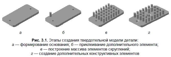 В общем случае порядок создания модели включает формирование основания, приклеивание и вырезание дополнительных элементов, построение массивов элементов и зеркальное копирование, создание дополнительных конструктивных элементов (рис. 3.1).