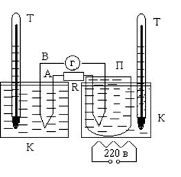 Градуировка термопары производится путем помещения одного из спаев в среду с переменной температурой, а другой - с известной постоянной в опыте температурой и определения соответствующих показаний гальванометра. Термопара (рис.2) состоит из двух разных проводников (А) и (В), сваренных своими концами. Один из проводников (А или В) разомкнут и его концы присоединены к клеммам гальванометра. Для поддержания постоянства температуры одного из спаев последний погружается в сосуд К1. Другой спай погружен в пробирку П с маслом, опущенную в сосуд К2, наполненный водой. Вода в сосуде К2 подогревается на электроплитке. Температура масла в пробирке П измеряется при помощи термометра Т2. Для ограничения тока через гальванометр последовательно с ним в цепь введено добавочное сопротивление R= 2кОм.