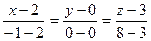 Пример (см. задание 1.6) Составим уравнение прямых А1, А2 и А1А3. А1(2, 0, 3), А2(-1, 0, 8), А3(0, 2, 4). Воспользуемся уравнением прямой, проходящей через две точки: