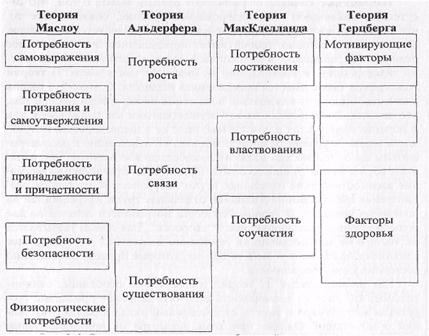 Рис.3.6. Соотношение групп потребностей в четырех теориях мотивации Отвлекаясь от различий и общности, которые характерны для рассмотренных концепций, можно указать на две присущие им общие характеристики. Во-первых, данные концепции в очень наглядном виде, четко и ясно излагают определенный взгляд на мотивацию — взгляд, подтвержденный эмпирическими исследованиями и уже достаточно продолжительное время использовавшийся в практике управления. В наибольшей мере данное утверждение относится к теориям Маслоу и Герцберга. Поэтому для того, чтобы лучше понимать мотивацию работников, менеджеры обязательно должны быть знакомы со всеми четырьмя теориями. Во-вторых, все четыре теории основное внимание уделяют анализу факторов, лежащих в основе мотивации, и в то же время практически не уделяют внимание анализу процесса мотивации. Данное замечание указывает на основной недостаток этих теорий, существенно ограничивающий возможности их непосредственного практического применения.