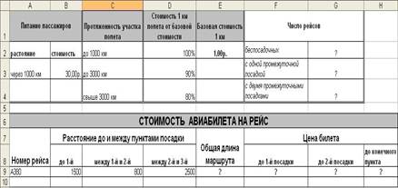 Завдання № 2. Розрахувати ціну авіаквитка до заданого пункту посадки. Ціна квитка складається з наступних складових: [ Вартість перельоту ] + [ Вартість харчування в польоті ] + [ Вартість доставки в аеропорт ] 1. Загальна вартість перельоту складається з вартостей на кожній ділянці маршруту. Вартість на кожній ділянці маршруту - [ Відстань до пункту посадки ] * [ Вартість 1 км]. Вартість 1 км залежить від протяжності ділянки і визначається як процентне співвідношення до деякої встановленої базової вартості 1 км. 2. Вартість харчування пасажира в польоті - [ Кількість разів ] * 30 р. Кількість разів розраховується як - [ Загальна відстань до пункту посадки ] / 1000, округлене до цілого. 3. Вартість доставки в аеропорт становить 50 р. і тільки для пасажирів тих рейсів, у яких загальна довжина маршруту понад 3500 км. Функції. Для розрахунку кількості разів харчування - ОКРУГЛВНИЗ () або ЦІЛЕ (), для розрахунку числа рейсів за типами РАХУНОК () Умовне форматування. Якщо загальна довжина маршруту понад 5000 км, то номер рейсу повинен відображатися напівжирним на рожевому фоні. Графік. [ Номер рейсу ] - [ Відстань до і між пунктами посадки ].