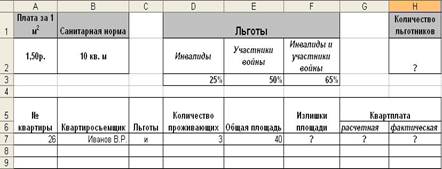 Завдання № 4. Розрахувати величину квартплати, яка складається з розрахункової і фактичної оплати. Розрахункова оплата визначається як [ Площа ] * [Оплата 1 кв.м. ]. Фактична оплата враховує як доплату за зайву площу, так і надані знижки пільговикам. Надлишок площі щодо санітарної норми оплачується у подвійному розмірі, але це не поширюється на пільговиків, і якщо в квартирі проживає одна людина, то йому покладена подвоєна санітарна норма. Інвалідам, учасникам війни надаються знижки: інвалідам - 25 %, учасникам війни - 50 %, інвалід і учасник війни - 65 %. Ці особи зазначаються в колонці [ Пільги ] буквами- «і», «у», «иу» відповідно. Умовне форматування. Якщо квартиронаймач інвалід і учасник війни, то осередок з номером квартири закрашивается пурпуровим. Графік. [ № квартири ] - [ Квартплата ]