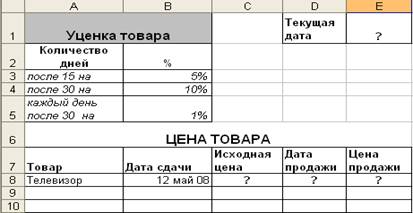 Завдання № 5. Комісійний магазин приймає товар для продажу, при цьому фіксується дата здачі і ціна. За умовами магазину після перших 15 -ти днів товар піддається уцінку на 5 %, після 30 -ти днів - на 10 % і далі на один відсоток за кожен день зберігання, проте товар не може бути знижений в ціні більш ніж на 75 %. Всі зниження товару розраховуються від спочатку встановленої ціни. У графі «Ціна продажу на сьогоднішній день» розраховується ціна товару до його продажу на кожен день, після продажу товару, тобто коли записана дата продажу, то в цій графі виводиться текст «продано». У графі «Ціна продажу» ціна буде розраховуватися виходячи з різниці дат здачі та продажу. Функції. Для відображення поточної дати - СЬОГОДНІ (). Умовне форматування. Якщо товар проданий через 30 днів, то осередок з назвою товару закрашивается в рожевий колір, через 50 днів в червоний колір. Графік. [Назва товару ] - [ Вихідна ціна ], [ Ціна продажу ]