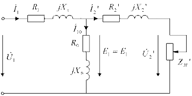 Режимы работы трансформатораДля исследования режимов работы трансформатора, расчета сетей целесообразно магнитную связь между первичным и вторичным контурами заменить электрической связью. На рис. 2.26 представлена Т-образная схема замещения трансформатора. На схеме: X1,X2,R1,R2 - индуктивные и активные сопротивления первичной и вторичной обмоток; ZH - сопротивление нагрузки; X0 - индуктивное сопротивление, обусловленное основным магнитным потоком трансформатора; R0 - активное сопротивление, обусловленное магнитными потерями мощности в магнитопроводе трансформатора; R´2=R2 n2, X´2 =X2 n2, I´2 =I2 /n, U´2 = U2 n - приведенные параметры вторичной обмотки трансформатора.