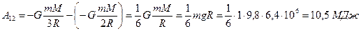 Здесь G = 6,67×10-11 Н×м2/кг2 – гравитационная постоянная, М – масса Земли. Из рисунка видно, что r1 = 3R, r2 = 2R. Тогда получаем (с учетом того, что на поверхности Земли