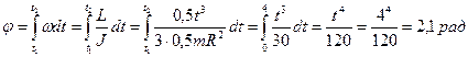 Пример 7 Диск вращается относительно оси, проходящей через его центр, ось диска перпендикулярна его плоскости. На диск действует вращающий момент, изменяющийся по закону М=0,5×t2 (Н×м). Масса диска 10 кг, его радиус 1 м, w0 =0. Определить: момент импульса диска относительно оси, проходящей через центр диска, в момент времени t = 3с; кинетическую энергию диска в момент времени t = 3с; угловой путь, пройденный за время от t1 =0 до t2 = 4c; число оборотов, сделанное диском за это время.