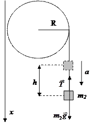 Ответ: 4,5 кг×м2/с; 2 Дж; 2,1 рад; 0,3 об. Пример 8 На однородный сплошной цилиндр массой m1 = 1 кг и радиусом R =0,1 м, ось которого расположена горизонтально, намотана невесомая нерастяжимая нить, на которой подвешен груз массой m2 = 0,2 кг. В момент времени t =0 система приходит в движение. Определить время, за которое тело m2 пройдет по вертикали вниз расстояние h = 2 м.