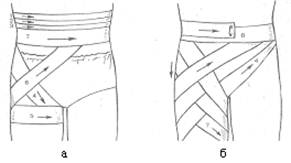Рис. 12. Колосовидная повязка на нижнюю область живота (а) и паховую область (б)