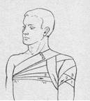 Рис. 14. Повязка на плечевой сустав Повязку на плечевой сустав накладывают, начиная от здоровой стороны из подмышечной впадины по груди (1) и наружной поверхности поврежденного плеча сзади через подмышечную впадину на плечо (2) по спине через здоровую подмышечную впадину (3) и, повторяя ходы бинта, пока не закроют весь сустав, закрепляют конец бинта на груди булавкой (рис.14). На культю предплечья или плеча после остановки кровотечения накладывается косыночная повязка. Под косынку на раненую поверхность накладываются стерильная салфетка и слой ваты, которые туго фиксируются косынкой.