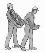 Осуществляется тремя основными методами: друг за другом; на замке из трех рук; на замке из четырех рук. В последних двух случаях носильщики располагаются лицом друг к другу. Метод друг за другом. Носильщик 1 становится спереди, спиной между ног пострадавшего, 2 – сзади него. Носильщик 1 берет пострадавшего под коленными суставами, фиксирует на согнутых предплечьях, 2 – охватывает его за ягодицы. Обоим носильщикам выпрямиться, поднять пострадавшего, начать движение (рис.84).