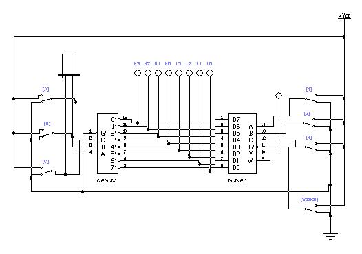 15. Исследуйте работу мультиплексора-демультиплексора. Для этого в программе EWB откройте схему мультиплексора-демультиплексора. (файл E:\MeLabs\lab4\mux_8_1.ewb). Включите моделирование. Исследуйте работу демультиплексора (demux), набирая нажатием клавиш A, B, C двоичный код адреса шины 0’-7’, на который поступает сигнал с информационного входа G’. При этом на индикаторе высвечивается 16-ричный код выбранной выходной шины.