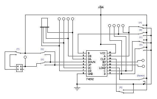 Включите моделирование. Подайте на вход С счетчика n импульсов. Запишите результат в шестнадцатиричном коде. 17. Исследуйте работу реверсивного счетчика. Откройте схему реверсивного счетчика (файл E:\MeLabs\Lab4\РЕВЕРС_СЧЕТ.ewb). Сформируйте на входе предустановки счетчика (кнопки A-D) число N (запись осуществляется клавишей Space). В прямом счете (DOWN=1) подайте ключом T – X входных импульсов (Внимание: при переключении кнопок U необходимо, чтобы ключ T находился в верхнем положении, иначе счетчик будет отсчитывать импульсы).