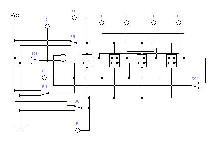 19. Исследуйте работу последовательного регистра, для чего необходимо открыть в программе EWB файл E:\MeLabs\Lab4\регистр_посл.ewb. Изучите работу регистра. Назначение входов: S, R – входы предустановки; D – информационный вход; С – вход синхронизации; вход O – определяет режим работы регистра (сдвиговый/циклический).
