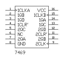 20. Исследуйте работу счетчика 7469 в режиме делителя частоты. Для этого выберите из библиотеки Digital интегральную схему счетчика 7469 (Dual 4-bit Binary Counter). Микросхема состоит из двух счетчиков 1 и 2. Причем 1-й счетчик разделен на два независимых одно- и трех-битных счетчика, управляемых соответствующими сигналами 1CLKA и 1CLKB. Поэтому для организации четырехразрядного двоичного счетчика необходимо завести сигнал с выхода 1QA на вход 1CLKB.