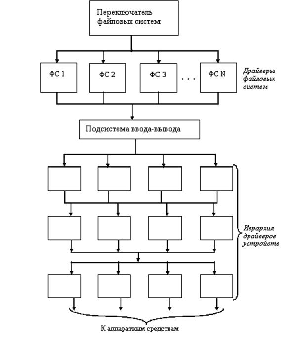 Для выполнения своих функций драйверы файловых систем обращаются к подсистеме ввода-вывода, образующей следующий слой файловой системы новой архитектуры. Подсистема ввода-вывода – это составная часть файловой системы, которая отвечает за загрузку, инициализацию и управление всеми модулями низших уровней файловой системы. Обычно эти модули представляют собой драйверы портов, которые непосредственно занимаются работой с аппаратными средствами. Кроме этого подсистема ввода-вывода обеспечивает некоторый сервис драйверам файловой системы, что позволяет им осуществлять запросы к конкретным устройствам. Подсистема ввода-вывода должна постоянно присутствовать в памяти и организовывать совместную работу иерархии драйверов устройств. В эту иерархию могут входить драйверы устройств определенного типа (драйверы жестких дисков или накопителей на лентах), драйверы, поддерживаемые поставщиками, драйверы портов, которые управляют конкретными адаптерами. Большое число уровней архитектуры файловой системы обеспечивает авторам драйверов устройств большую гибкость – драйвер может получить управление на любом этапе выполнения запроса – от вызова приложением функции, которая занимается работой с файлами, до того момента, когда работающий на самом низком уровне драйвер устройства начинает просматривать регистры контроллера. Многоуровневый механизм работы файловой системы реализован посредством цепочек вызова. В ходе инициализации драйвер устройства может добавить себя к цепочке вызова некоторого устройства, определив при этом уровень последующего обращения. Подсистема ввода-вывода помещает адрес целевой функции в цепочку вызова устройства, используя заданный уровень для того, чтобы должным образом упорядочить цепочку. По мере выполнения запроса, подсистема ввода-вывода последовательно вызывает все функции, ранее помещенные в цепочку вызова. Внесенная в цепочку вызова процедура драйвера может решить передать запрос на следующий уровень, или, если это возможно, процедура может удовлетворить запрос, не передавая его дальше по цепочке.