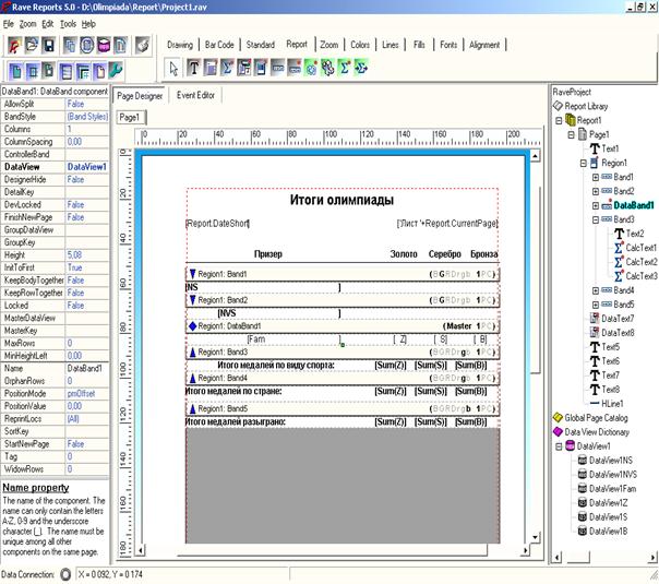 Отчет имеет специфические свойства: FullName - определяет полное имя отчета (допускается краткое описание отчета, можно использовать символы кириллицы). PageList - список страниц отчета, редактор этого свойства можно вызвать кнопкой с многоточием; в окне редактора можно добавлять в отчет глобальные страницы и изменять порядок вывода страниц. Parameters/PIVars - список параметров/переменных отчета. Параметры и переменные используются при написании кодов обработки событий, возникающих во время выполнения отчета. Printer – содержит имя принтера, куда отчет направляется на печать. Если свойство пусто, то отчет выводится на принтер, используемый по умолчанию. Global Page Catalog (каталог глобальных страниц) - содержит перечень глобальных страниц проекта. Глобальные страницы доступны для любого отчета в проекте, на них удобно располагать титульные листы, рамки для чертежей и т.п. Чтобы добавить в отчет пустую глобальную страницу, нужно выполнить команду File/New Global Page. Глобальные страницы добавляются в отчет с помощью редактора списка страниц. Data View Dictionary (словарь просмотра данных) - содержит перечень объектов, соединенных с данными из внешних источников. Пользователь может добавить в проект новый объект данных, выполнив команду File/New Data Object. При этом откроется диалоговое окно Data Connections, в котором для выбора предлагаются следующие типы объектов: Data Lookup Security Controller - контроллер безопасности просмотра данных. Обеспечивает аутентификацию пользователей по имени и паролю; Database Connection - соединение с внешней базой данных с использованием технологий ADO, BDE, dbExpress; Direct Data View - прямой просмотр данных. Создает просмотр данных для активного соединения с источником, например с компонентами данных Rave в приложении Delphi; Driver Data View - просмотр данных с помощью драйвера. Создает просмотр данных на основе уже имеющегося в словаре соединения; Simple Security Controller - простой контроллер безопасности. Поддерживает список пар «имя пользователя = пароль» для организации доступа к отчету.