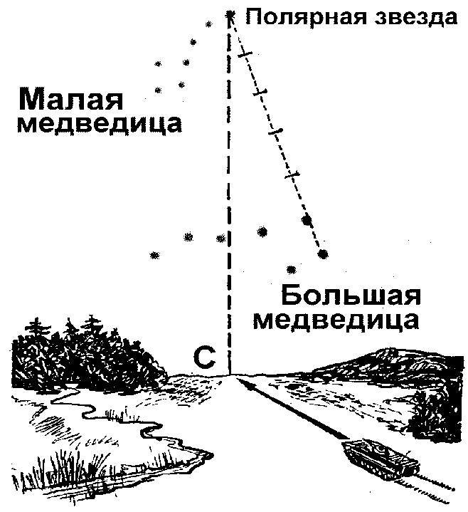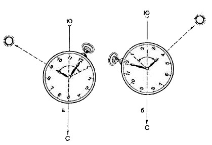Определение сторон горизонта и расстояний на местности без карты. Для отыскания направления по сторонам света вначале определяют направление север-юг; после чего, став лицом к северу, определяющий будет иметь направо - восток, налево - запад. Стороны света обыкновенно находят по компасу, а при отсутствии его - по Солнцу, Луне, звездам и по некоторым признакам местных предметов. Определение направлений на стороны горизонта по небесным светилам При отсутствии компаса или в районах магнитных аномалий, где компас может дать ошибочные показания (отсчеты), стороны горизонта можно определить по небесным светилам: днем - по Солнцу, а ночью - по Полярной звезде или Луне. По Солнцу. В северном полушарии места восхода и захода Солнца по временам года следующее: зимой Солнце восходит на юго-востоке, а заходит на юго-западе; летом Солнце восходит на северо-востоке, а заходит на северо-западе; весной и осенью Солнце восходит на востоке, а заходит на западе. Солнце примерно находится в 7.00 на востоке, в 13.00 - на юге, в 19.00 - на западе. Положение Солнца в эти часы и укажет соответственно направления на восток, юг и запад. Самая короткая тень от местных предметов бывает в 13 часов, и направление тени от вертикально расположенных местных предметов в это время будет указывать на север. Для более точного определения сторон горизонта по Солнцу используются наручные часы.