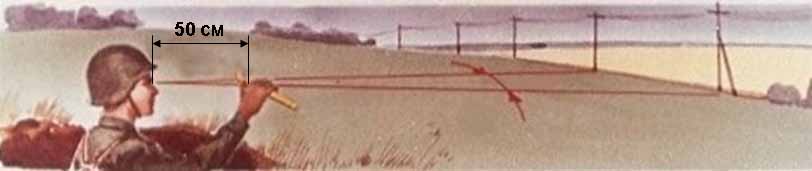 Расстояние до предметов в метрах определяют по формуле: Например: 1) угловой размер наблюдаемого в бинокль ориентира (телеграфный столб с подпоркой), высота которого 6 м, равен малому делению сетки бинокля (0-05). Следовательно, расстояние до ориентира будет равно: 2) угол в тысячных, измеренный линейкой, расположенной на расстоянии 50 см от глаза, (1 мм равен 0-02) между двумя телеграфными столбами 0-32 (телеграфные столбы находятся друг от друга на расстоянии 50 м). Следовательно, расстояние до ориентира будет равно: 3) высота дерева в тысячных, измеренная линейкой 0-21 (истинная высота дерева 6 м). Следовательно, расстояние до ориентира будет равно: Определение расстояний по линейным размерам предметов заключается в следующем. С помощью линейки, расположенной на расстоянии 50 см от глаза, измеряют в миллиметрах высоту (ширину) наблюдаемого предмета. Затем действительную высоту (ширину) предмета в сантиметрах делят на измеренную по линейке в миллиметрах, результат умножают на постоянное число 5 и получают искомую высоту предмета в метрах.