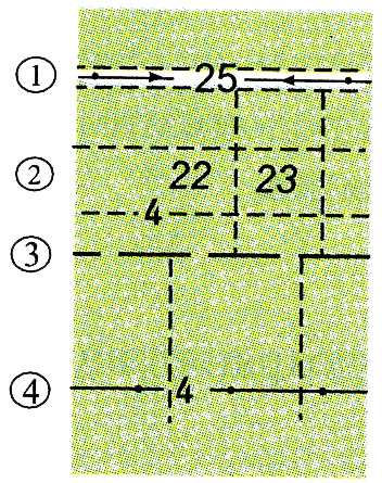2) прочие просеки;25,4 - ширина просек в метрах, 22, 23 - номера лесных кварталов;