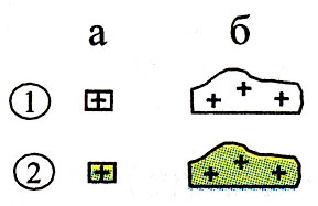Отдельные рощи, не выражающиеся в масштабе карты, имеющие значение ориентиров: 1) хвойные, 2) лиственные, 3) смешанные