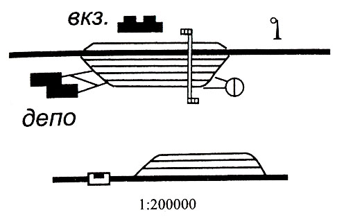 Депо, вокзалы, станционные пути, выражающиеся в масштабе карты; переходные мостики, семафоры и светофоры, поворотные круги