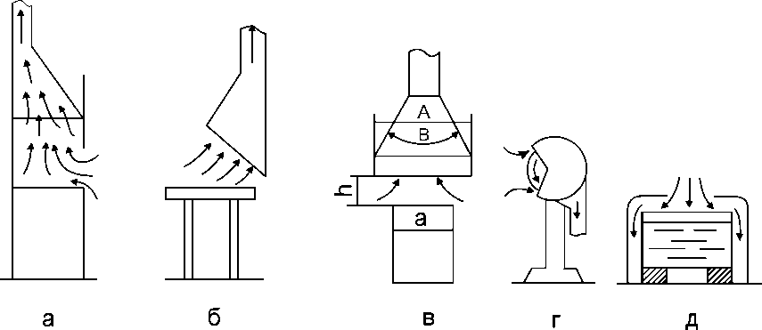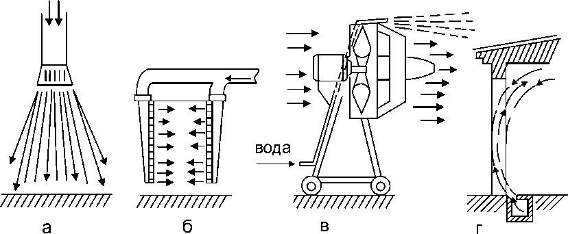 а) стационарный воздушный душ; б) подвижный воздушный душ; в) воздушно-тепловая завеса с боковой подачей воздуха; г) воздушно-тепловая завеса с нижней подачей воздуха.