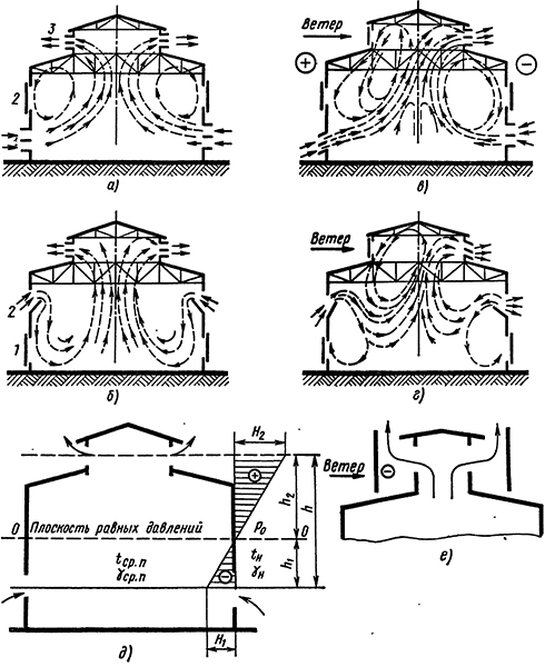 Рис.1. Аэрация зданий: a, б — открытие створок проемов при безветрии в теплое и холодное время года: в, г — то же при боковом ветре; д — распределение давления воздуха в здании цеха; е — незадуваемые фонари
