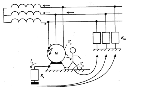 Устройство заземления. Корпус электрооборудования соединятся заземляющим проводником(1) с заземлителем (2) имеющий малое сопротивление (2-10 Ом). Если произошло замыкание и корпус электроустановки оказался под напряжением, то прикоснувшийся к нему человек попадает под напряжение прикосновения (Vпр), которое определяется выражением: